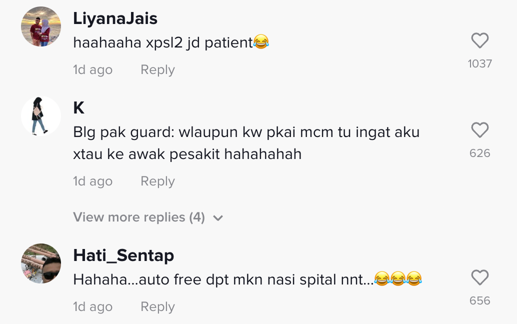 Namun, lain pula dengan video yang tular di TikTok ini apabila seorang wanita terhibur melihat saudaranya ditahan pengawal dek kerana baju sama dengan pesakit hospital telah mencuri tumpuan ramai.