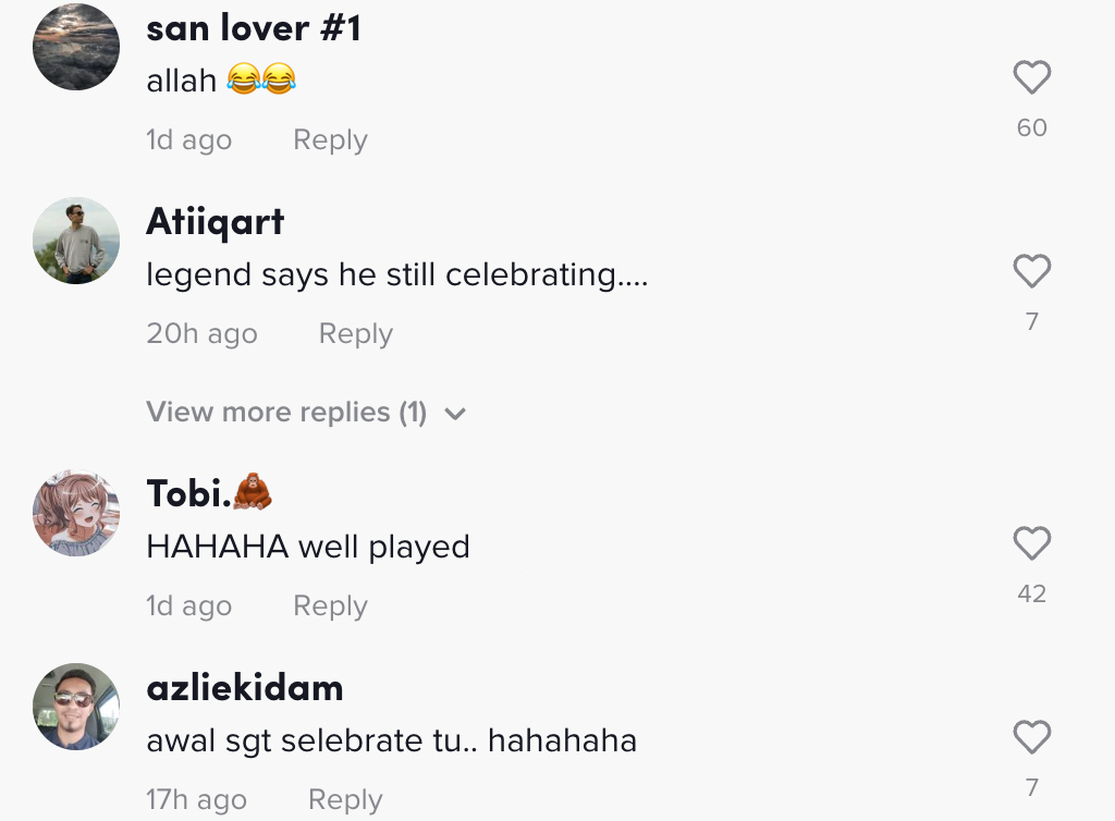 Sementara itu, tinjauan di ruangan komen mendapati rata-rata netizen turut terhibur dan menyakat aksi pemuda tersebut.