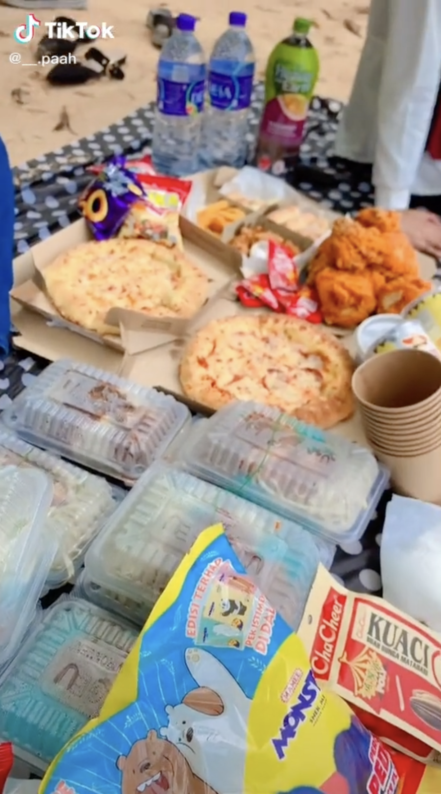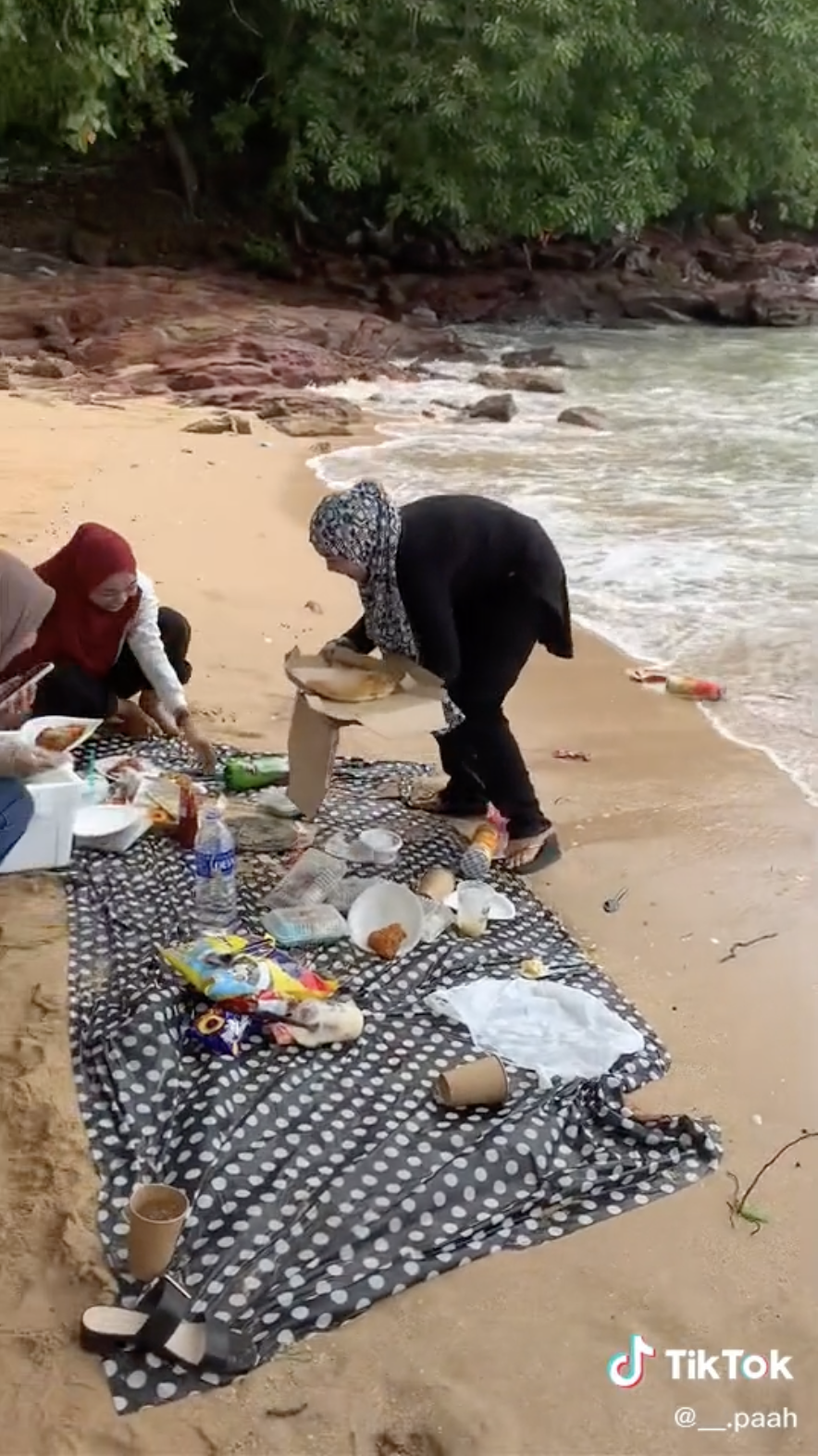 Mereka dilihat menyusun makanan dan minuman di atas sehelai kain di tepi pantai tersebut. Namun, apa yang lebih mencuri tumpuan adalah keadaan itu tidak bertahan lama apabila mereka mula menyedari air semakin dekat.