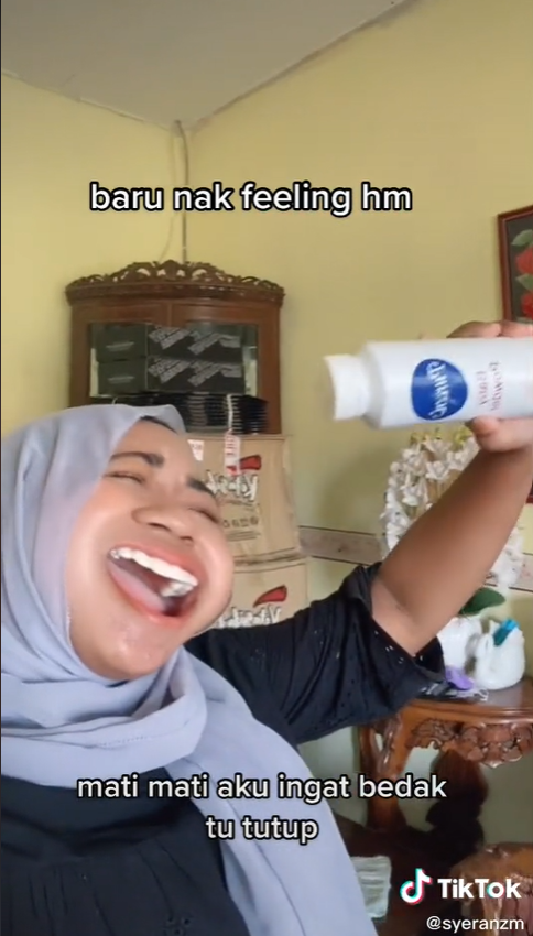 Sama seperti video yang tular di TikTok ini apabila seorang gadis menyanyi menggunakan bedak sebagai hiburan diri mencuri tumpuan ramai.