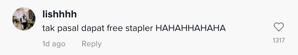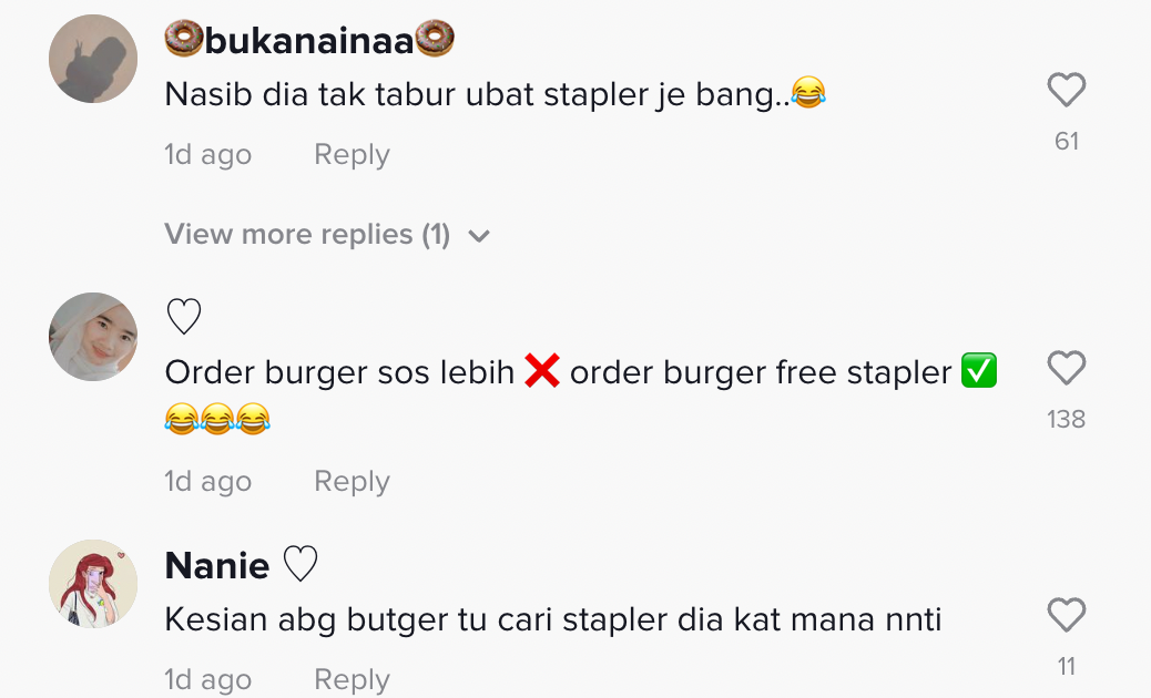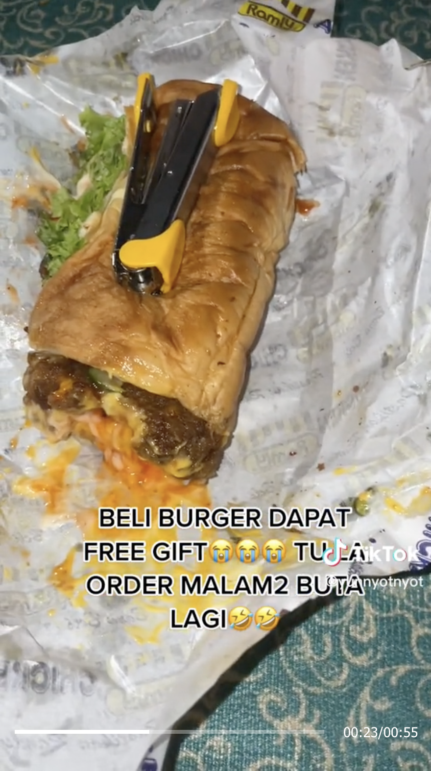 Dapat dilihat stapler diletakkan di atas burger tersebut. Situasi itu membuatkan mereka semua ketawa kerana tidak menyangka akan perkara itu.