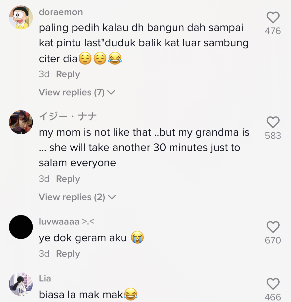 Lebih melucukan, apabila kali ketiga mengajak balik, si ibu akan berdiri tanda nak balik tapi masih boleh lagi meneruskan sembangnya. Gadis itu sempat menulis di ruangan komen bahawa dia selalu dikenakan begini oleh ibunya ketika ikut beraya.