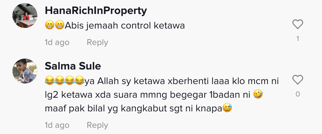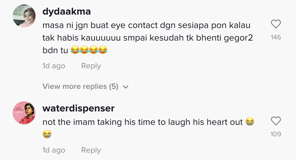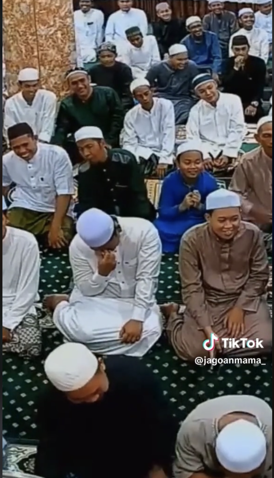 Situasi itu membuatkan makmum dibelakangnya yang memakai baju putih cuba menahan diri daripada gelak selepas mendengarnya.