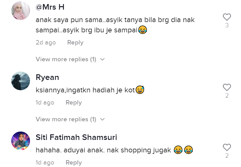 Malah, ramai berkongsi pengalaman sama anak mereka yang cemburu melihatnya. Ada juga yang terpaksa membeli barang untuk anak mereka kerana mahu mereka merasakan bagaimana posmen menghantar barang milik mereka.