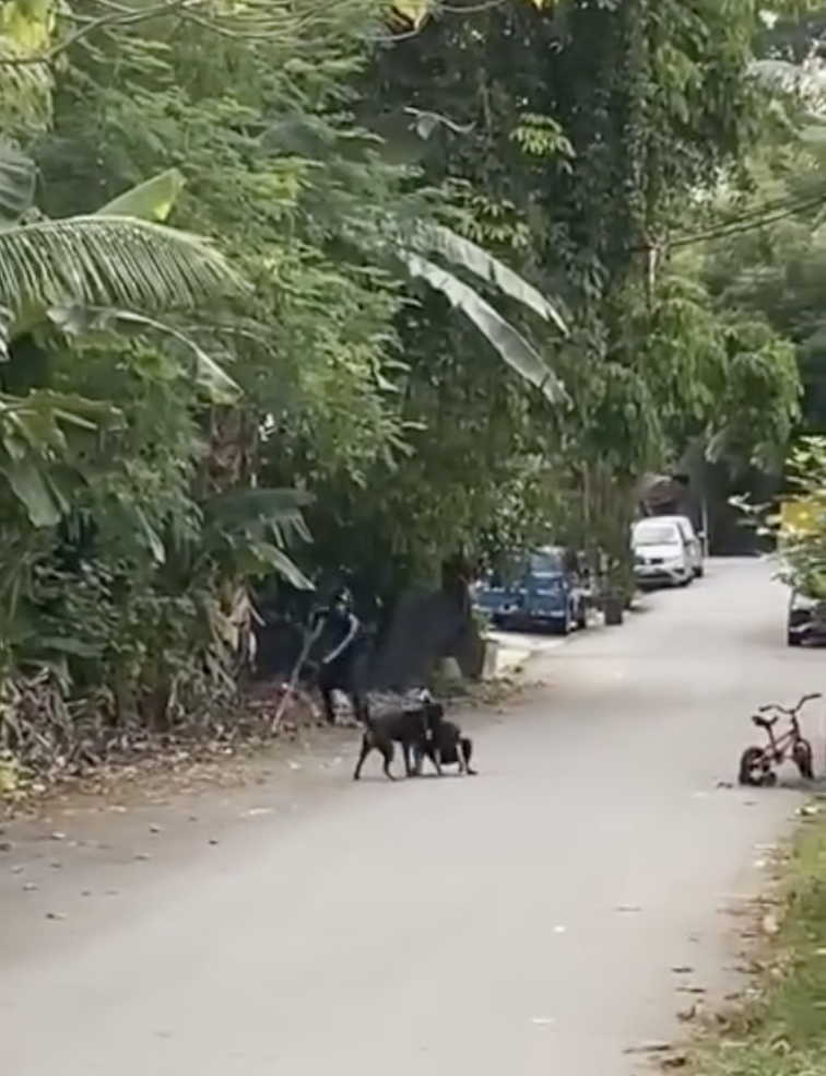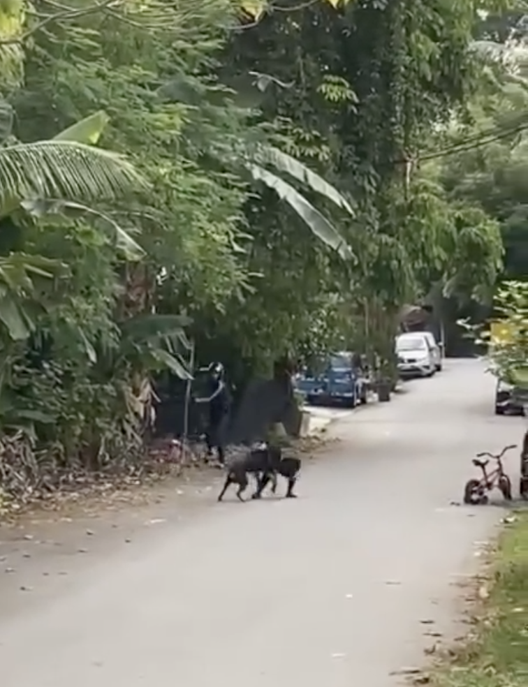 Seorang penunggang motosikal yang kebetulan berada di lokasi turut dilihat cuba membantu dengan menghalau anjing tersebut.
