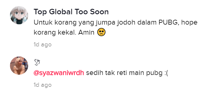 Cover image via @putrialiashahhiza (TikTok)Kalau dulu orang muda gilakan Clash of Clans, lain pula kini apabila permainan tembak-menembak paling popular iaitu PlayerUnknown's Battlegrounds (PUBG) yang sering menjadi kegilaan ramai