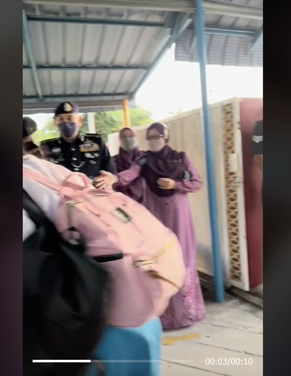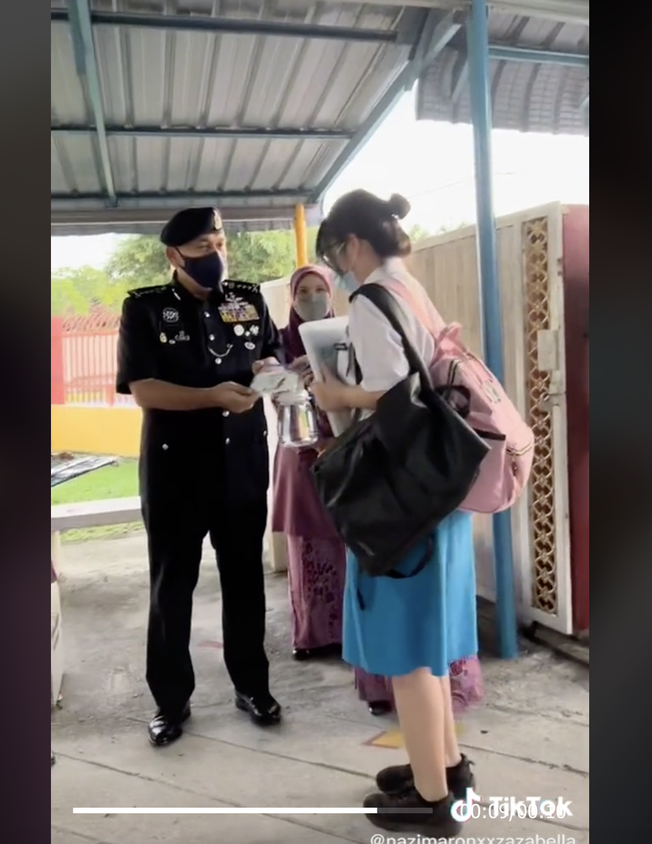 Menerusi video yang dikongsi oleh @nazimaronxxzazabella, kelihatan seorang pelajar perempuan berbangsa Cina yang datang lewat. Pada ketika itu pula, sedang berlangsungnya Program Hari Pertama Sekolah Bersama Ketua Polis Perak.