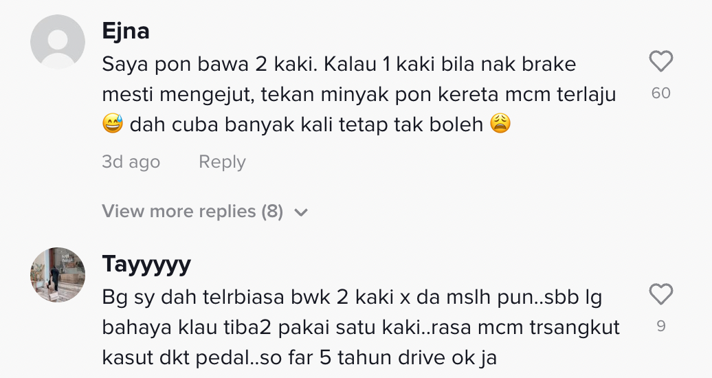 Namun, salah seorangnya kemudian berkongsi rakannya yang memandu kereta automatik dengan menggunakan dua kaki.