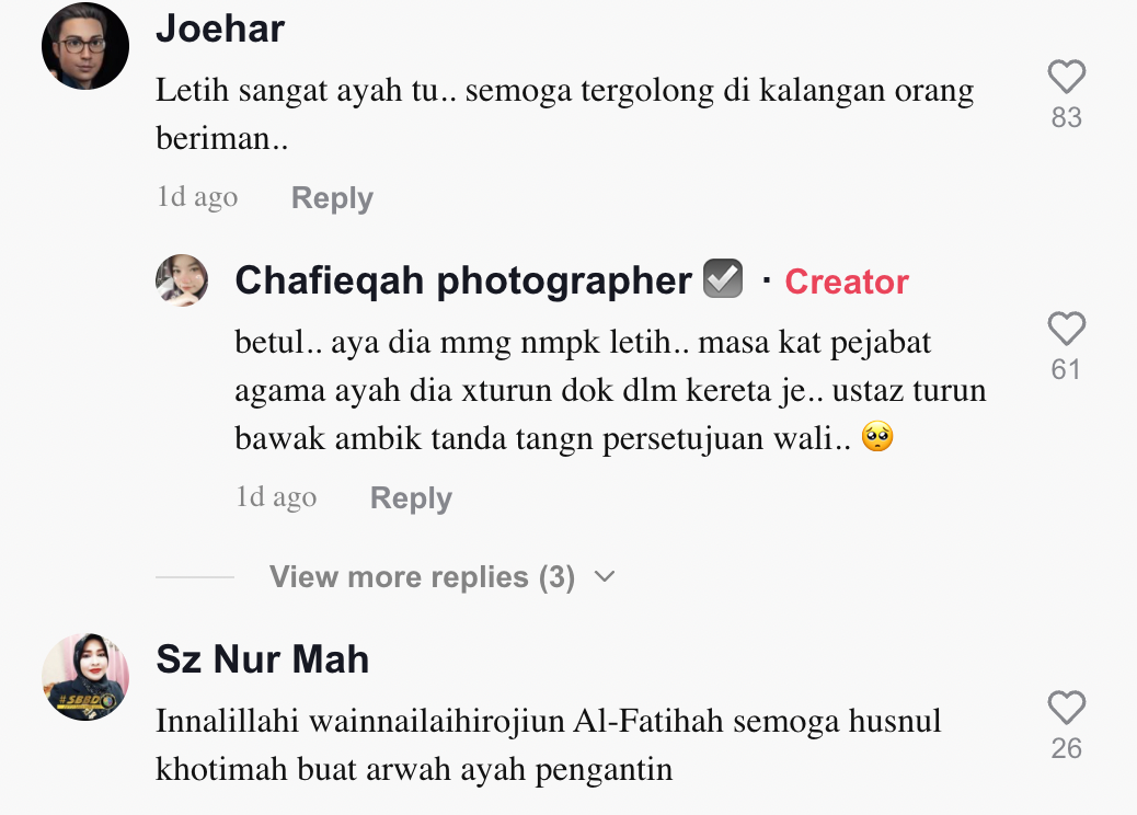 Menurut pemilik video, bapa pengantin perempuan sudah mula keletihan sebelum berlangsungnya majlis pernikahan. Difahamkan juga, semasa di pejabat agama, bapa pengantin perempuan tidak turun kereta dan ustaz hanya ambil tanda tangan persetujuan wali saja.