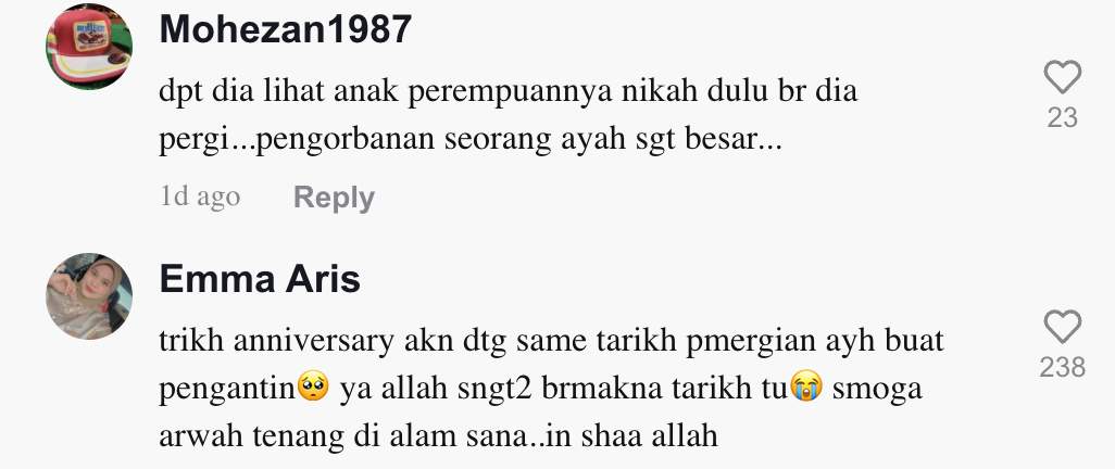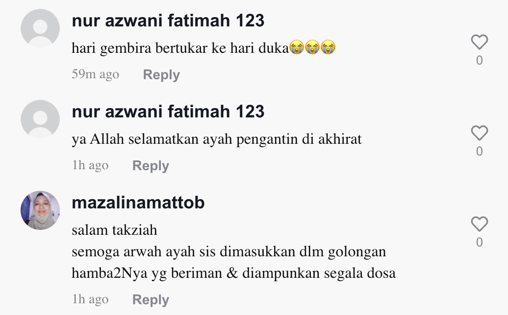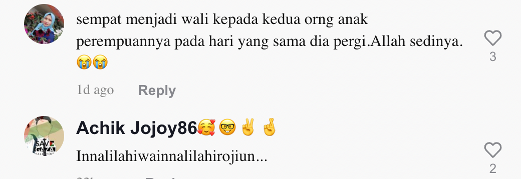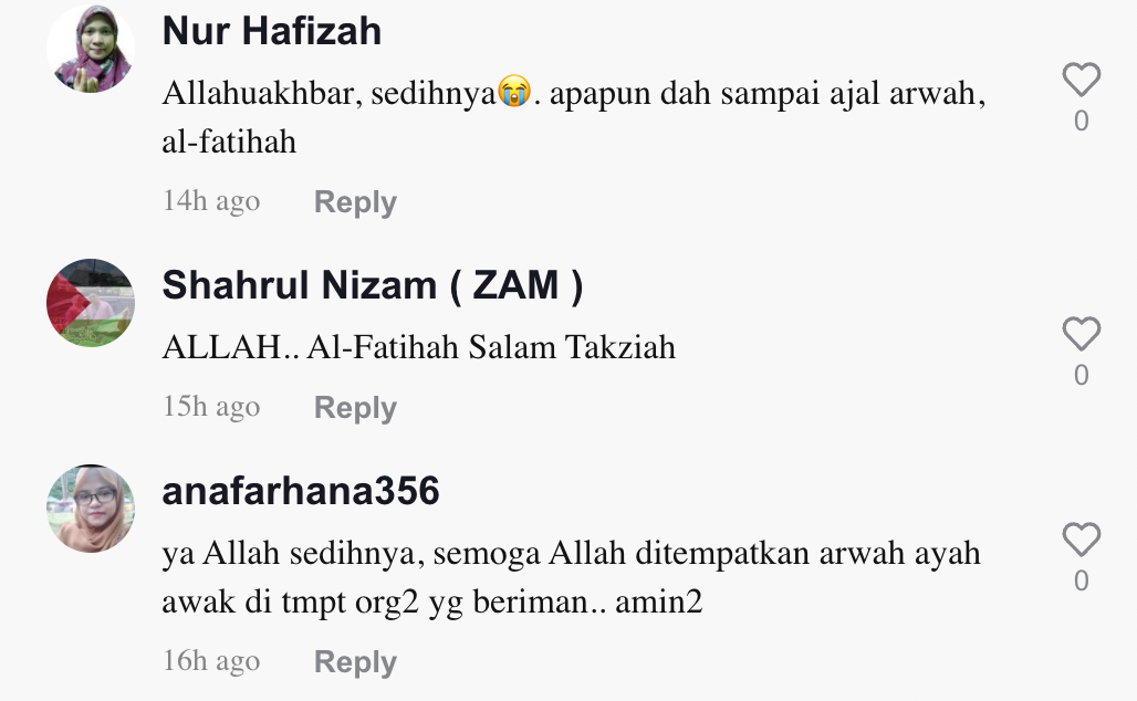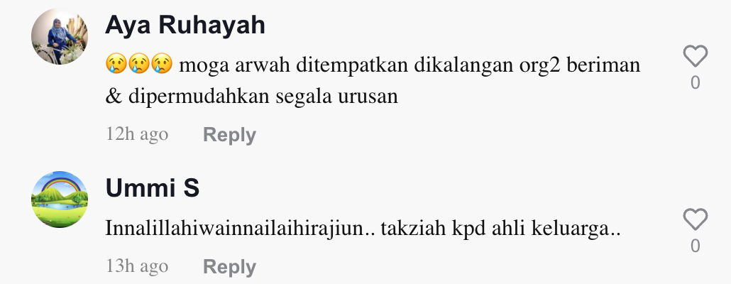 Dalam pada itu, tinjauan di ruangan komen mendapati rata-rata netizen turut memberi ucapan takziah dan berkongsi rasa sebak mereka.