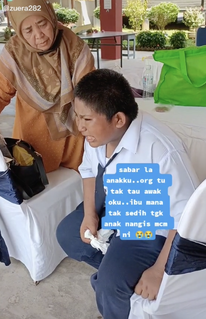 Menerusi video yang dimuat naik oleh @zuera282, kelihatan seorang wanita sedang merakam anaknya yang kurang upaya sedang menangis sambil ditenangkan oleh gurunya.