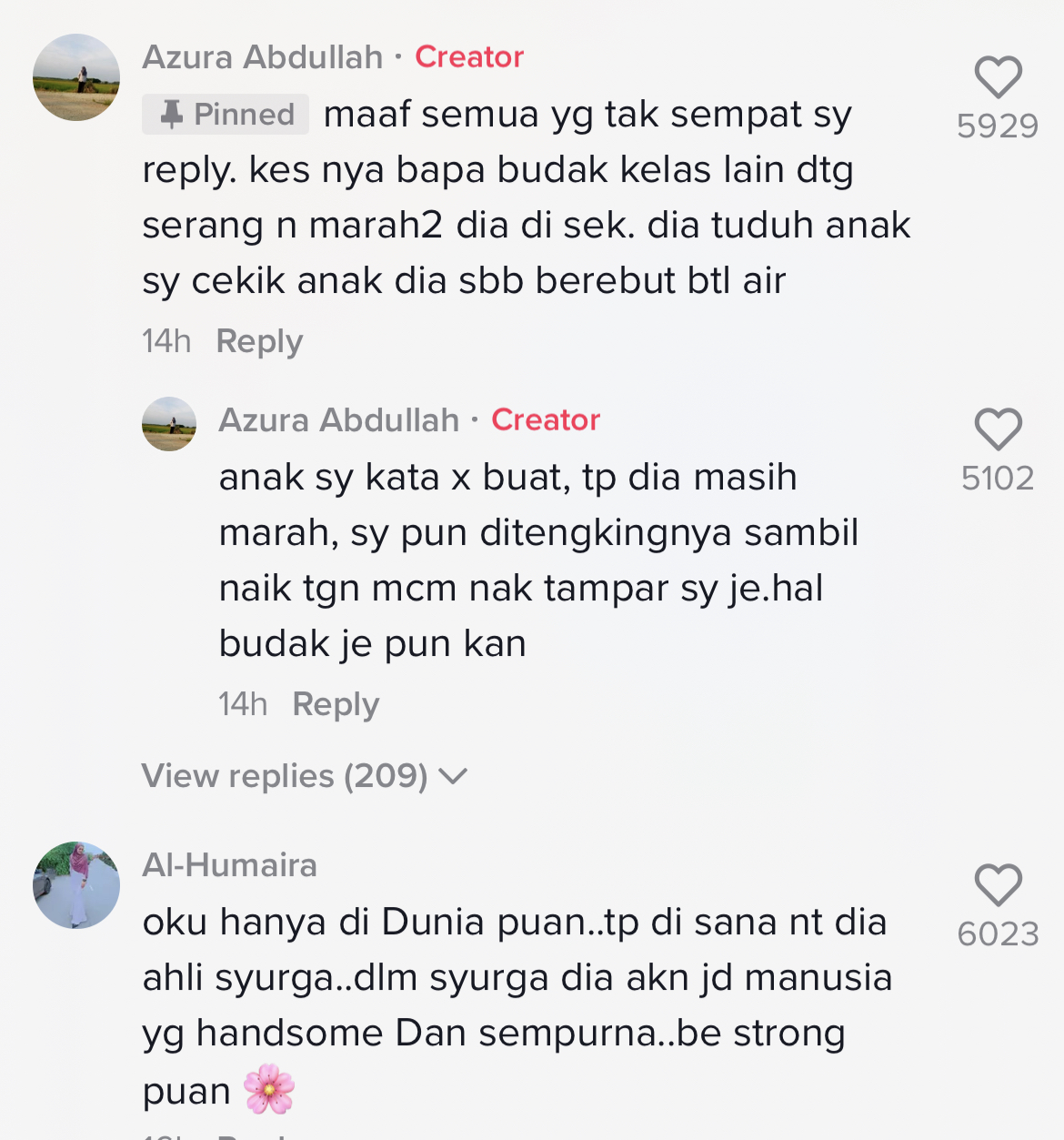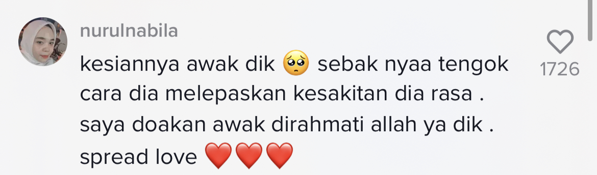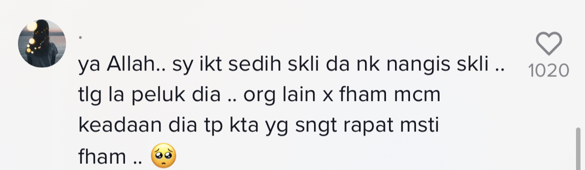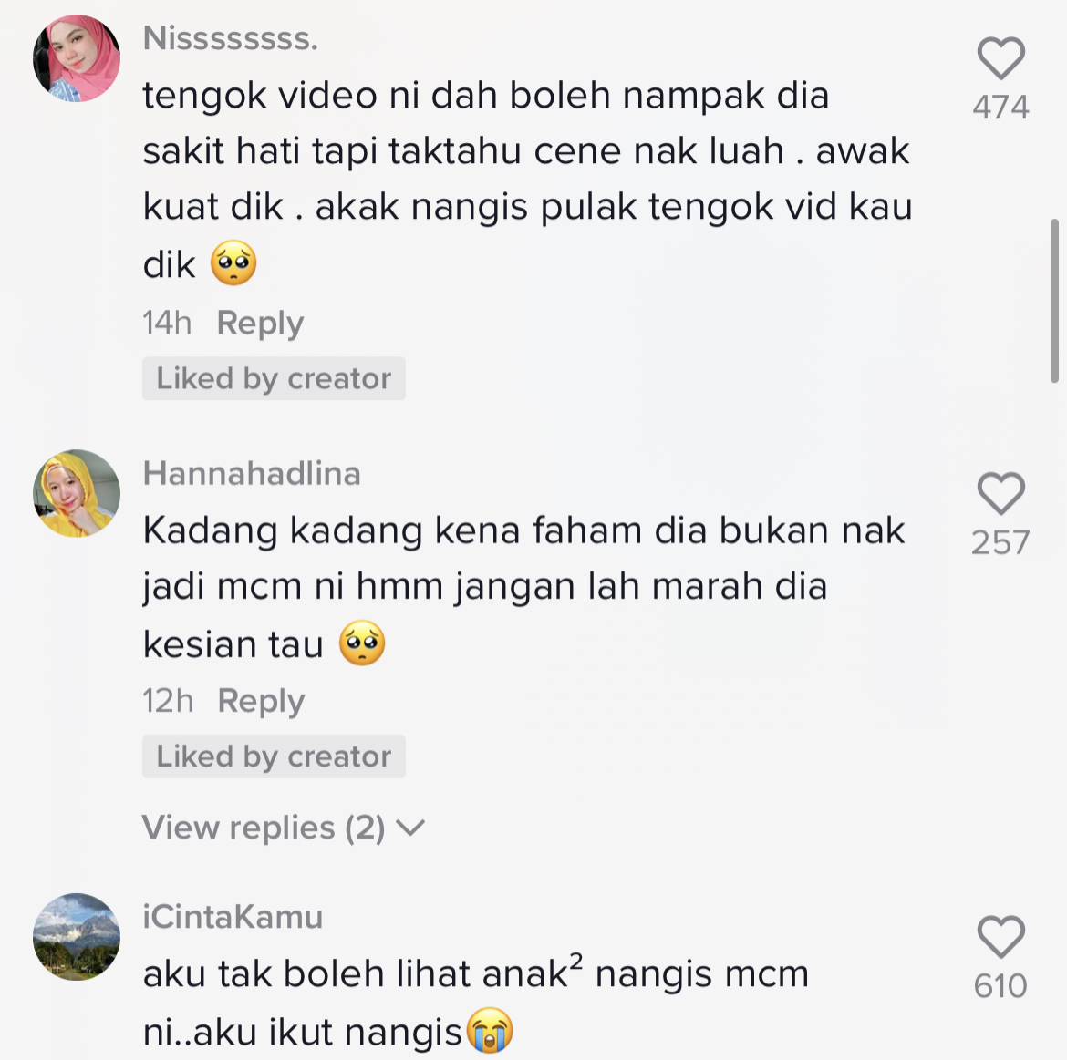 Sementara itu, tinjauan di ruangan komen mendapati rata-rata netizen turut bersedih melihat video tersebut. Malah, ada yang turut memberi kata-kata semangat kepada ibu kanak-kanak tersebut.