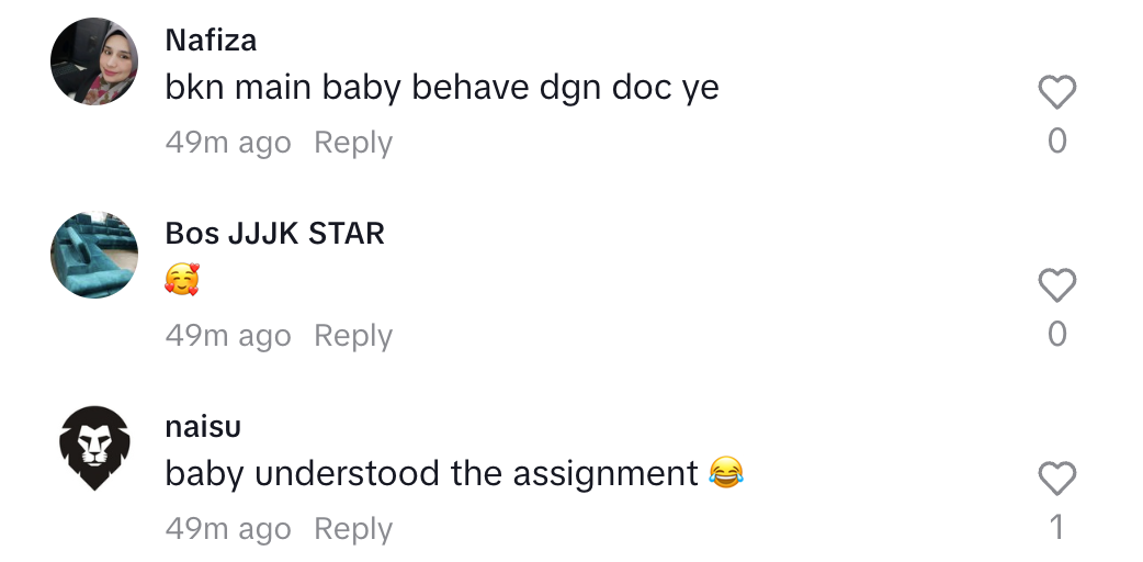 Dalam pada itu, tinjauan di ruangan komen mendapati rata-rata netizen turut memberikan pelbagai reaksi dan ada juga yang menyakat dengan memberitahu bayi itu pandai berlakon.