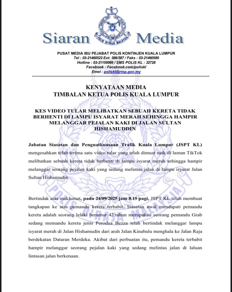 Driver E-Hailing Memandu Secara Berbahaya Hampir Rempuh Pejalan Kaki Kini Ditahan Polis