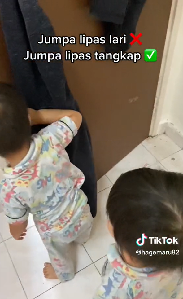 Menerusi video yang dimuat naik oleh @hagemaru82 di TikTok, kelihatan dua budak lelaki sedang cuba untuk menangkap seekor lipas di pintu rumah mereka.