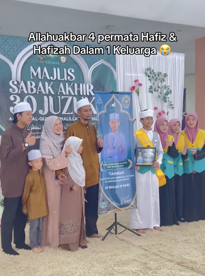 Satu video yang dimuat naik di TikTok baru-baru ini mencuri perhatian ramai apabila empat orang anak dalam sebuah keluarga berjaya menghafaz Al-Quran dan memperoleh gelaran Al-Hafiz serta Al-Hafizah