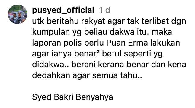 Dalam pada itu, pendedahan Erma Fatima turut mendapat perhatian daripada pendakwah, PU Syed yang menyarankan agar dia segera membuat laporan polis mengenai kumpulan tersebut.