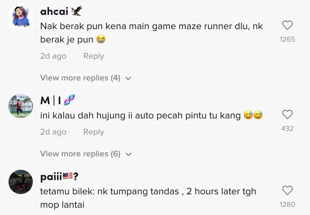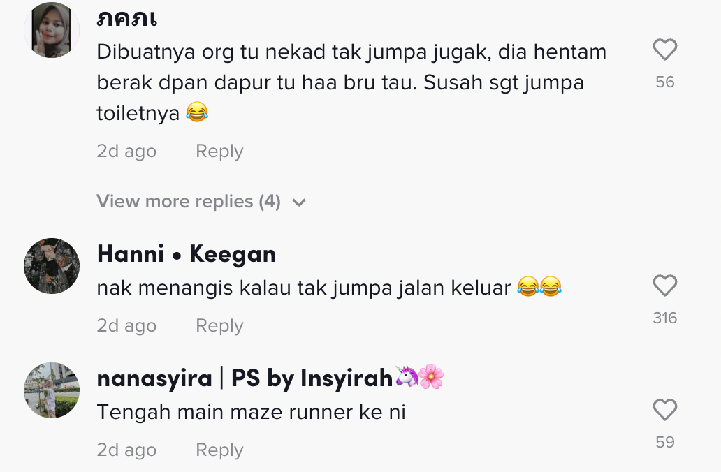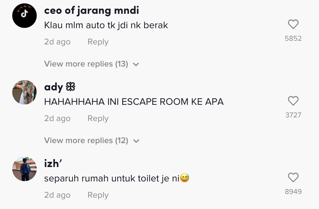 Lebih menarik perhatian lagi, pada akhir video dia menunjukkan pintu terakhir itu adalah ruang tamu. Situasi itu membuatkan ramai terfikir bagaimanakah keadaan jika seseorang itu sakit perut nanti.