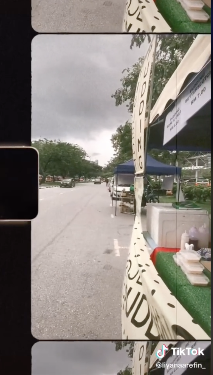 Dia kemudian turut menunjukkan kedai rakannya yang berada di sebelah. Namun tidak lama selepas itu, angin mula bertiup kuat sehingga menyebabkan khemah kedai rakannya itu terbang.