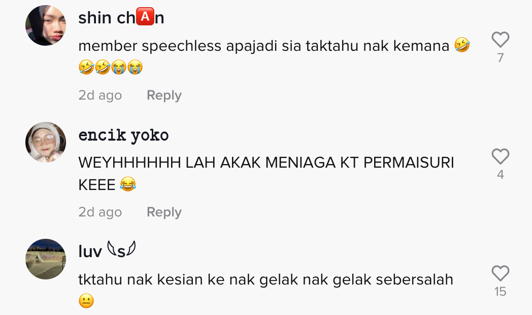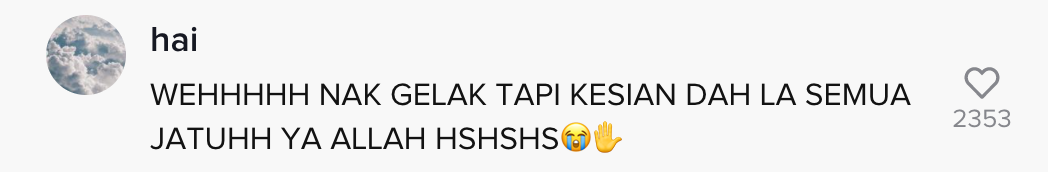 Dalam pada itu, tinjauan di ruangan komen mendapati rata-rata netizen turut meluahkan rasa simpati mereka mengenai kejadian itu. Malah, ada juga yang tergelak melihat gadis itu ketawa.