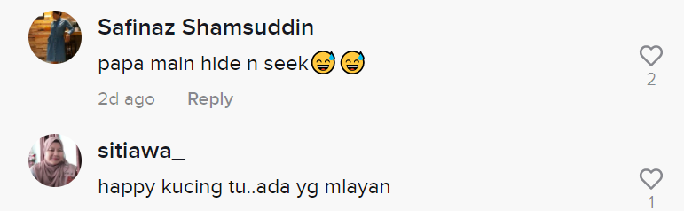 Apa yang lebih menghiburkan adalah, kini dapat dilihat si ayah begitu rapat dengan kucing peliharaan mereka, bahkan si ayah siap bermain sorok-sorok bersama kucing tersebut. Gelagat itu mengundang ketawa ramai yang mencuit hati.