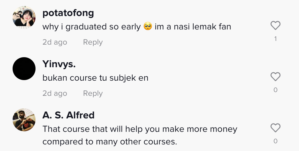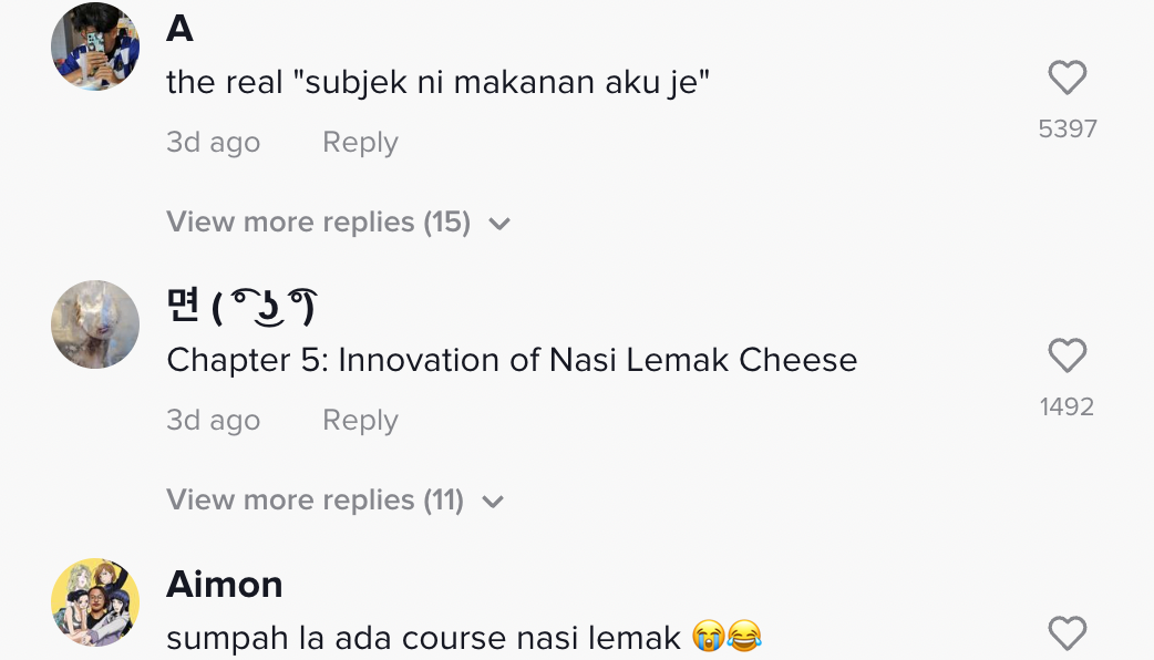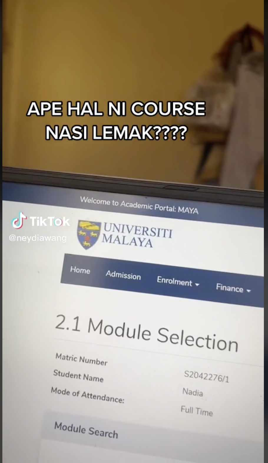 Namun, dia kemudian berkongsi terjumpa kursus yang ditawarkan oleh universiti berkenaan. Dapat dilihat dia menunjukkan kursus Nasi Lemak And The Food System. Situasi itu membuatkan dia merasa agak pelik.