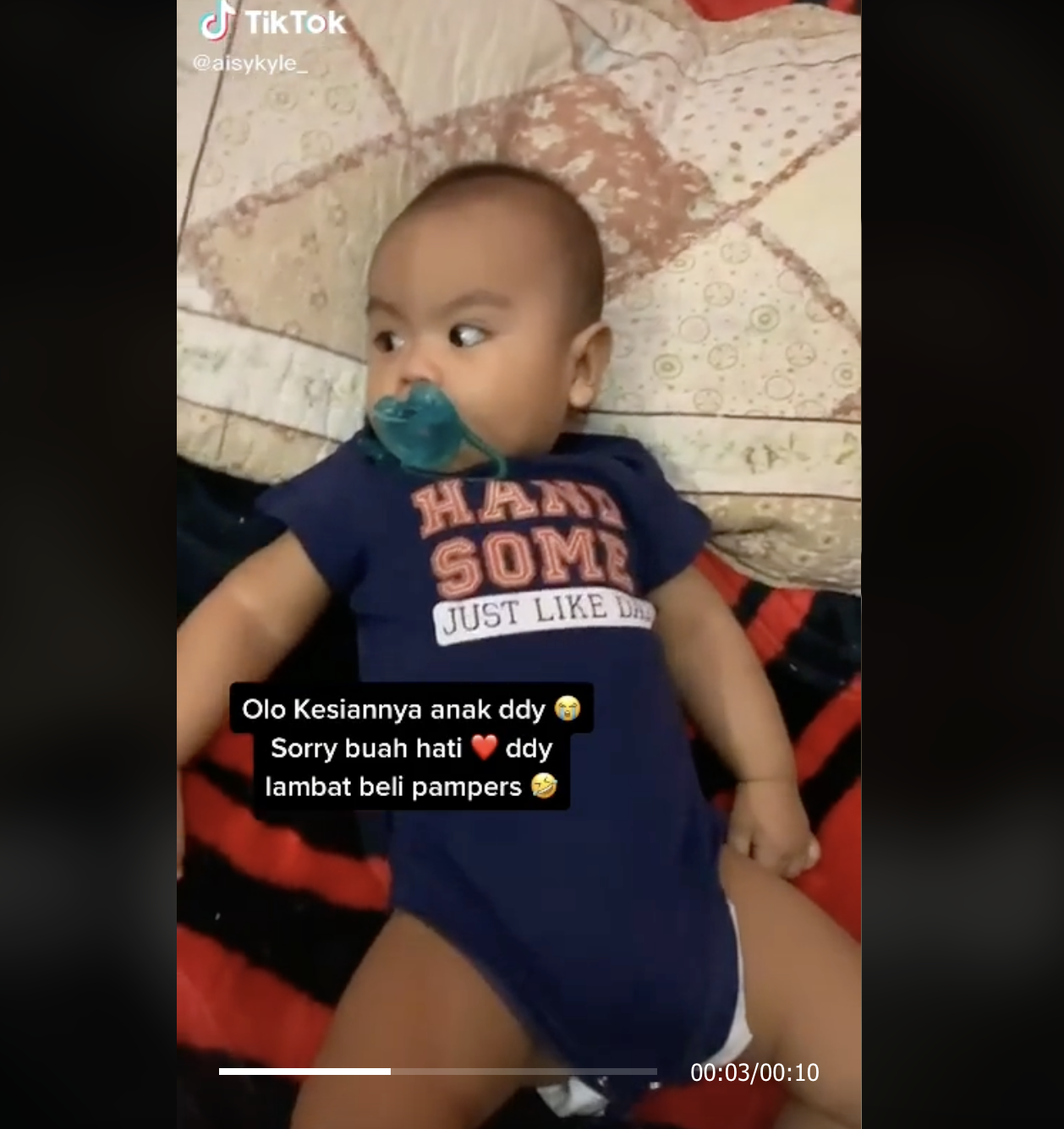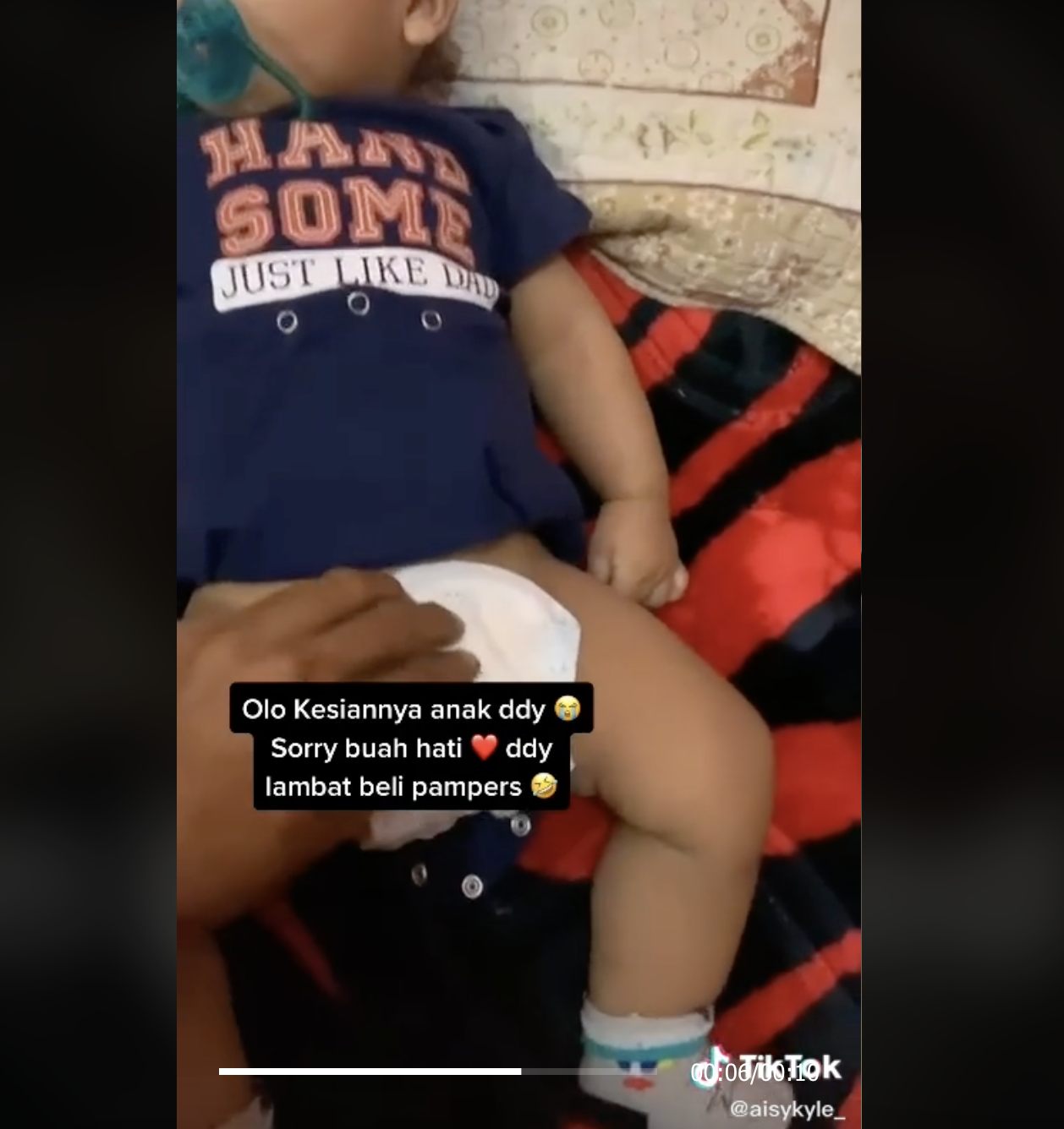 Menerusi video yang dimuat naik oleh @aisykyle_, kelihatan seorang lelaki sedang merakam anaknya sambil bertanya jenis pampers apa yang dipakainya.