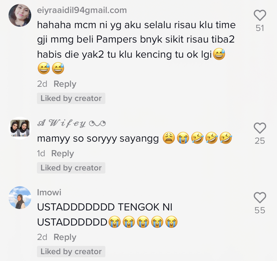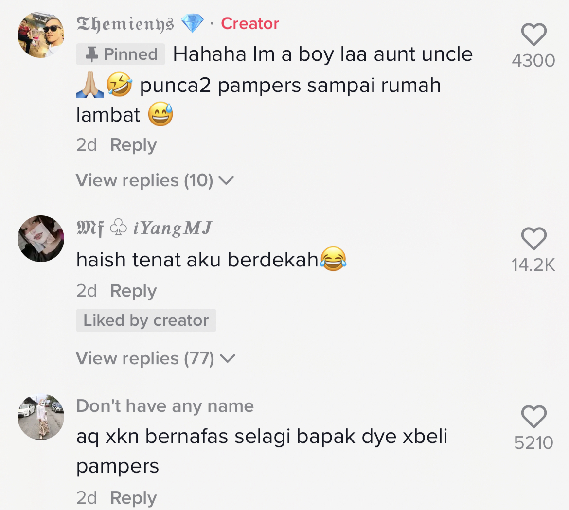 "Hahahaha macam ni yang aku selalu risau, kalau time gaji memang beli pampers banyak sikit risau tiba-tiba habis dia yakyak tu kalau kencing tu ok lagi" – Netizen