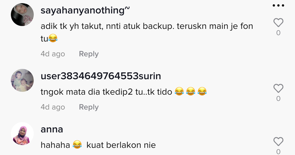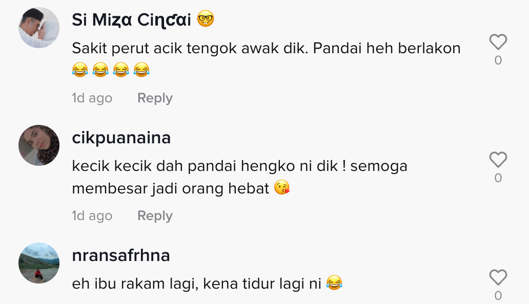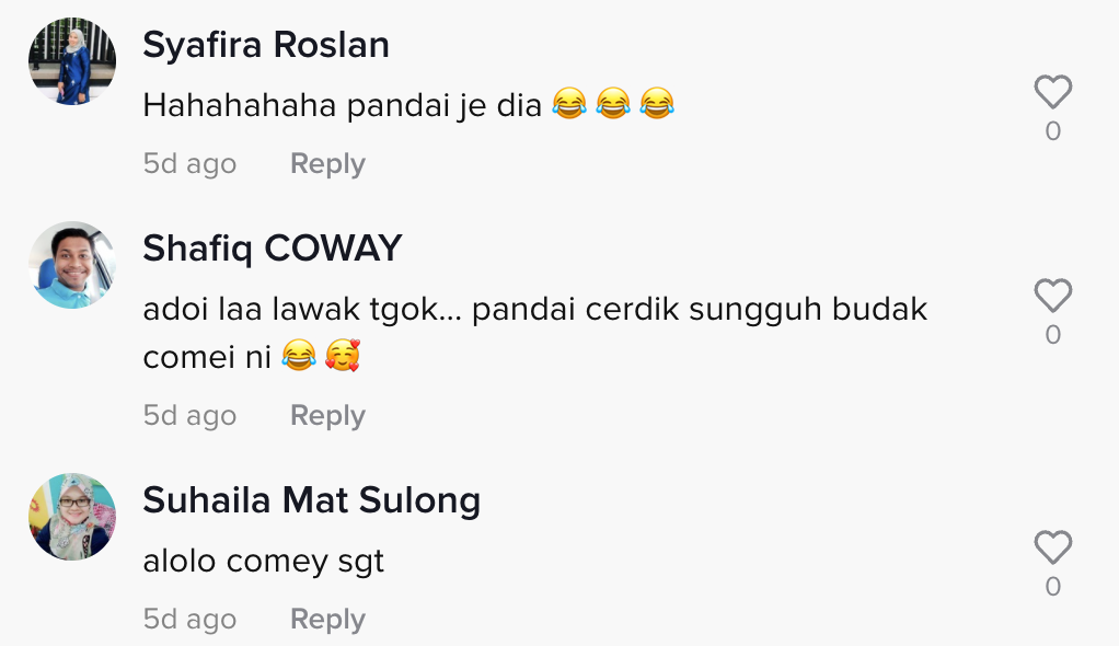 Dalam pada itu, tinjauan di ruangan komen mendapati rata-rata netizen turut merasa terhibur melihat gelagat budak itu. Malah, ramai yang memberikan reaksi mereka masing-masing mengenainya.