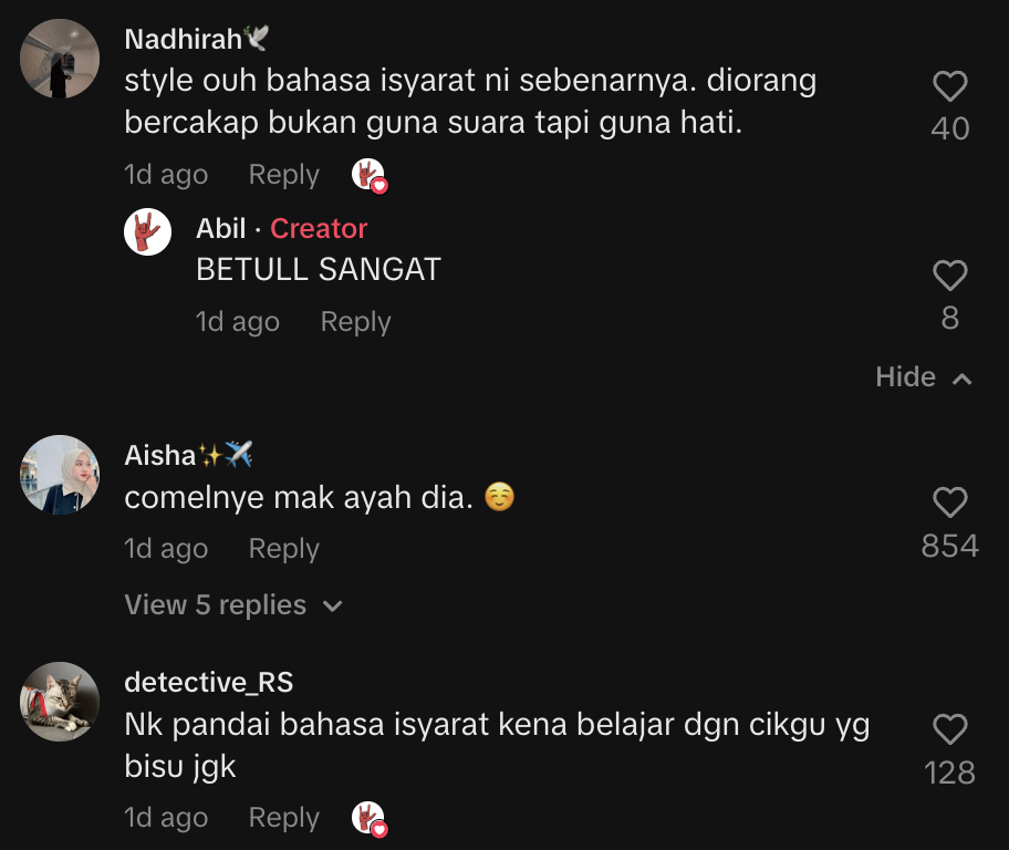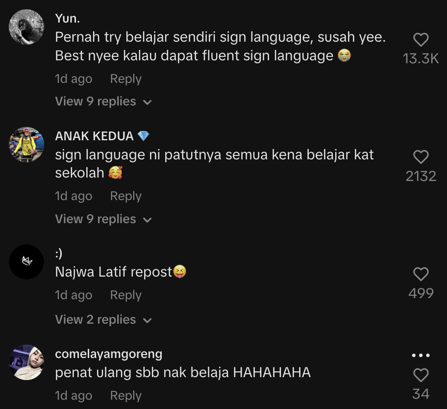 Malah, ada yang mencadangkan bahasa isyarat sepatutnya menjadi salah satu subjek di sekolah supaya ramai dapat belajar.