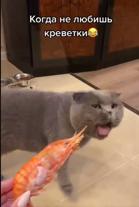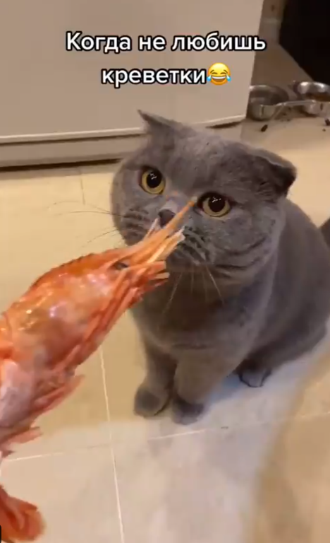 Menerusi video tersebut, kelihatan seekor kucing tersebut sedang diberikan seekor udang oleh tuannya.