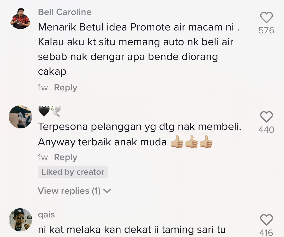Dalam pada itu, tinjauan di ruangan komen mendapati rata-rata netizen turut terhibur melihat cara mereka promote air tersebut. Malah, ada juga netizen yang memuji kreativiti peniaga-peniaga tersebut.
