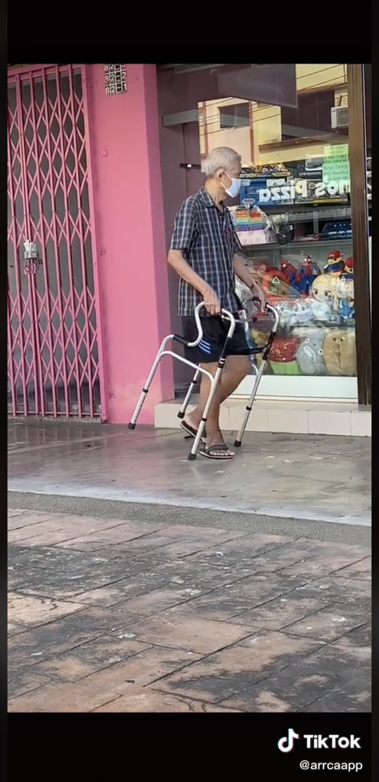Menerusi video tersebut, kelihatan seorang uncle sedang berjalan di sebuah kawasan kedai berseorangan diri sambil menggunakan tongkatnya.