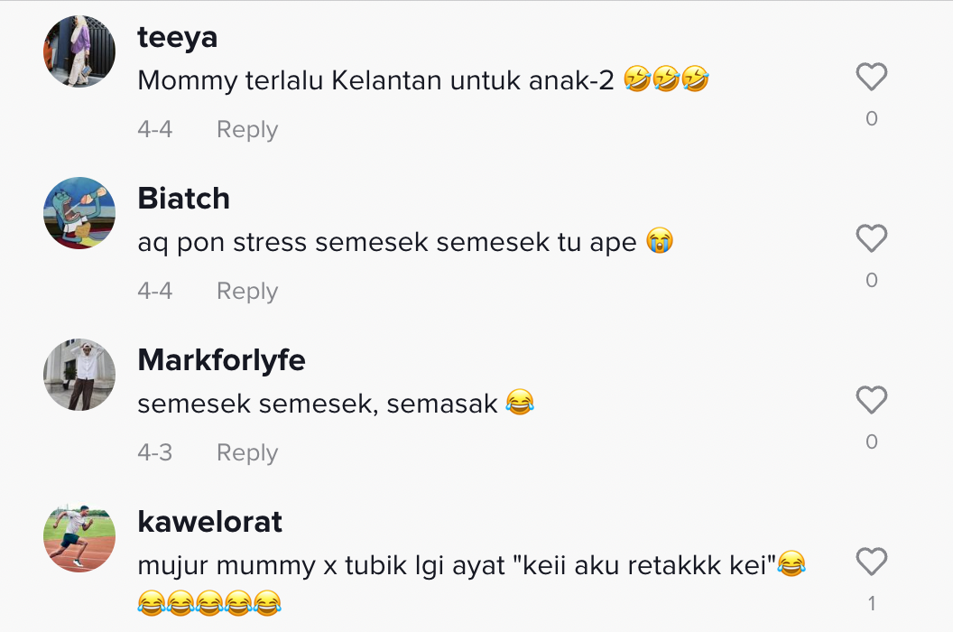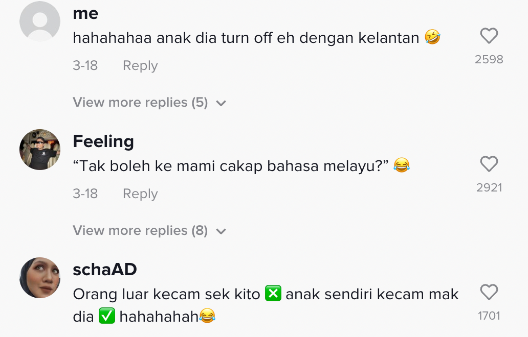 Sama seperti video di TikTok ini apabila seorang budak lelaki menyuruh agar ibunya tidak bercakap dalam loghat Kelantan telah mencuit hati ramai.