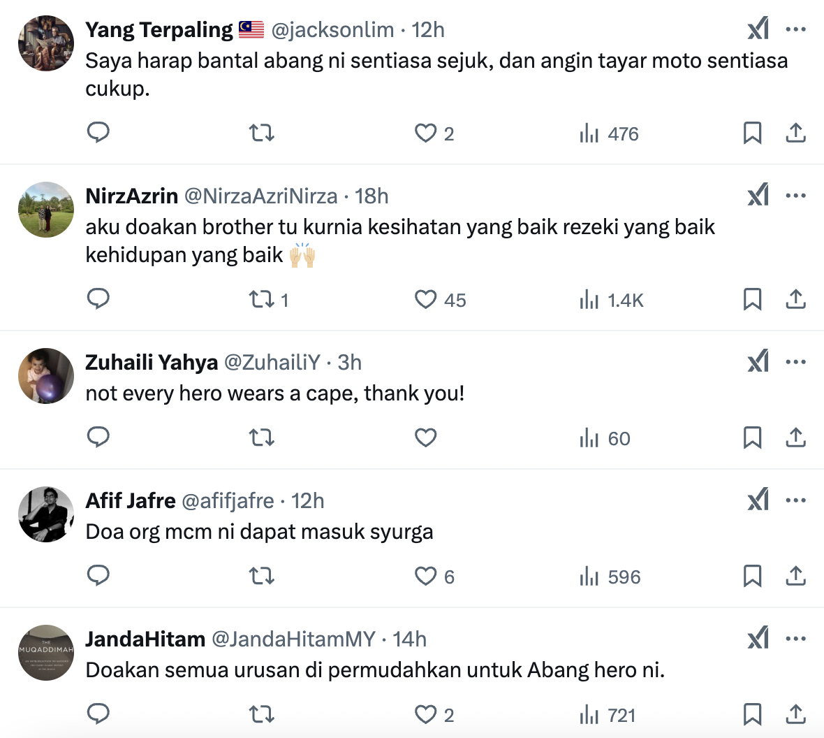 Tindakannya itu mendapat pujian ramai dan berterima kasih kerana telah mengalihkannya. Ada yang berpendapat jika tayar tersebut masih di situ berkemungkinan membahayakan banyak nyawa.