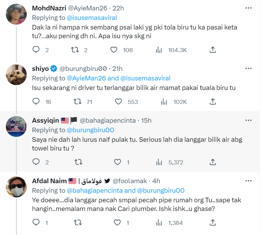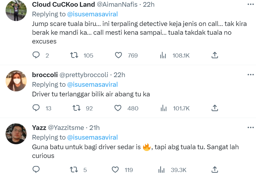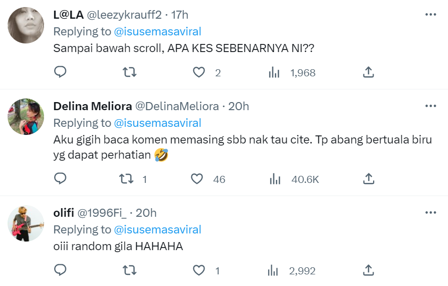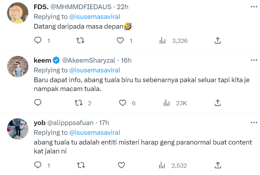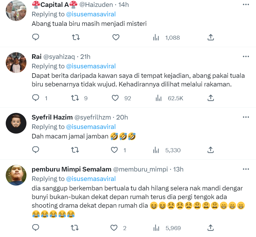 Susulan tularnya video itu yang kini mencecah sehingga 353.8K views, 6,492 likes dan 120 comments di Twitter, rata-rata netizen turut terhibur dengan situasi itu dan tertanya-tanya siapakah gerangan abang bertuala biru tersebut.