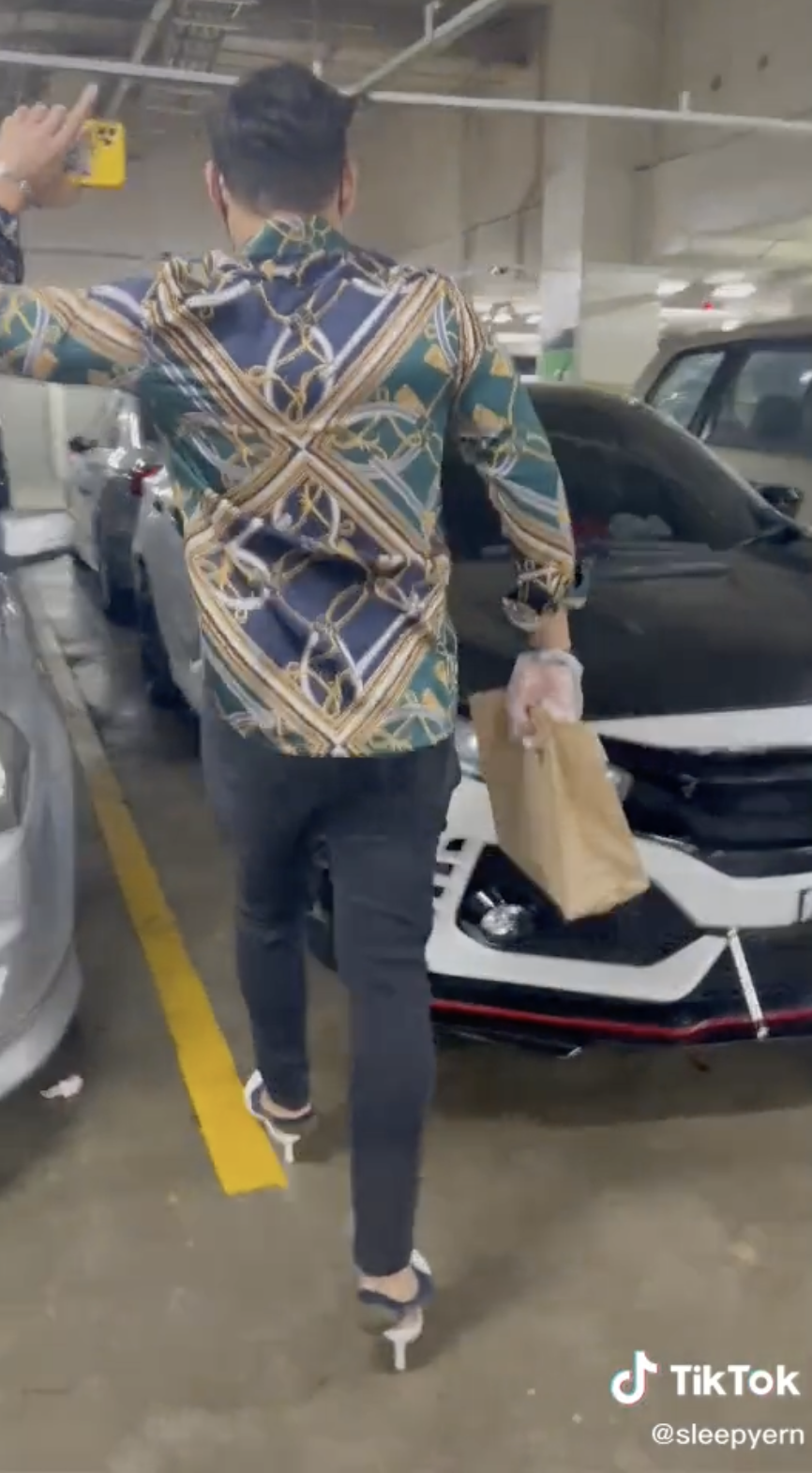 Apa yang lebih mencuri tumpuan adalah teman lelakinya itu dilihat memakai heels teman wanitanya sambil berjalan ke arah kereta dengan gaya seperti sedang melakukan cat walk.