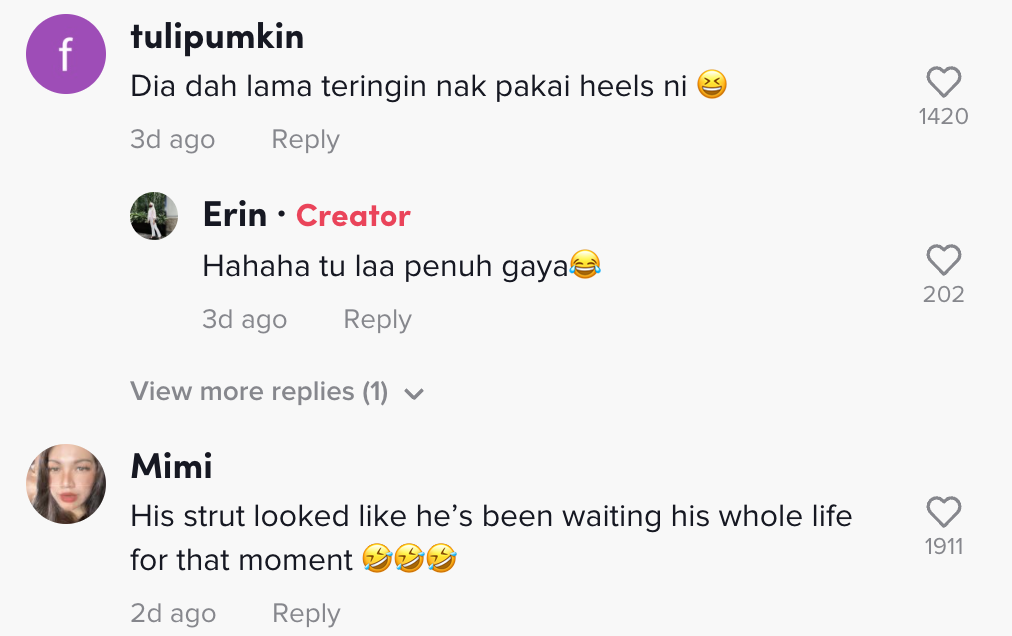 Sementara itu, tinjauan di ruangan komen mendapati rata-rata netizen turut terhibur melihat gelagat lelaki itu yang terus bertukar gaya jalan semasa memakai heels.