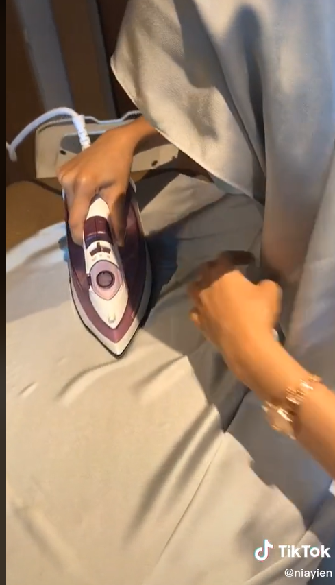 Begitulah situasi yang dialami oleh seorang gadis ini apabila videonya tular di TikTok kerana dia sanggup menggosok tudung yang berkedut walaupun sedang memakainya.