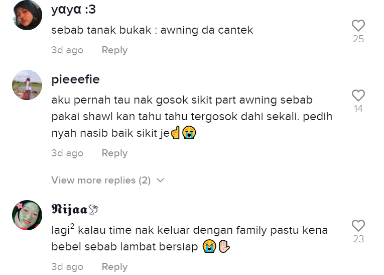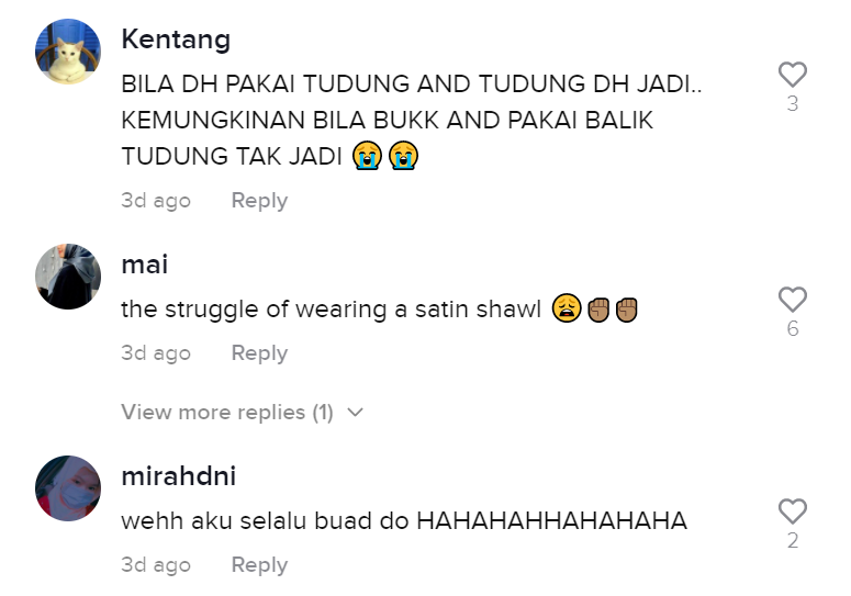Malah, ramai yang dapat relate situasi itu dengan mereka. Ada juga yang berkongsi pengalaman sama memakai tudung satin yang sememangnya susah dijaga.