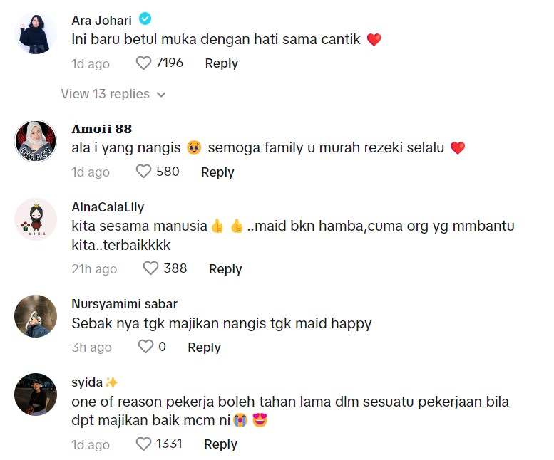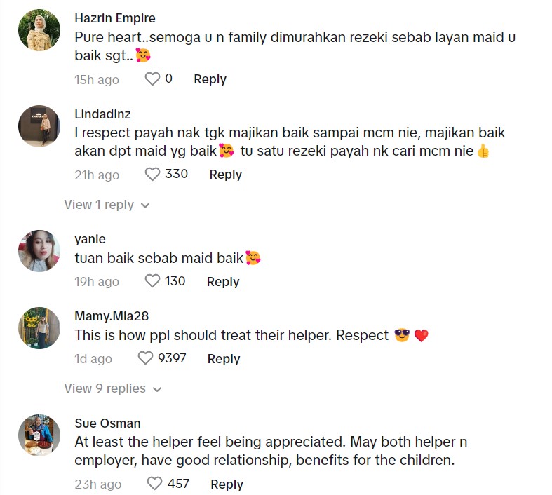 Rata-rata komen yang diberikan oleh netizen di TikTok memberikan pujian terhadap majikan tersebut kerana menghargai dan menjaga kebajikan pembantu rumahnya.