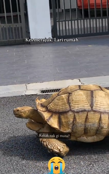 Itu yang dapat dilihat dalam sebuah video yang tular di TikTok memaparkan seekor kura-kura gergasi dilihat seakan-akan lari dari rumah tuannya.