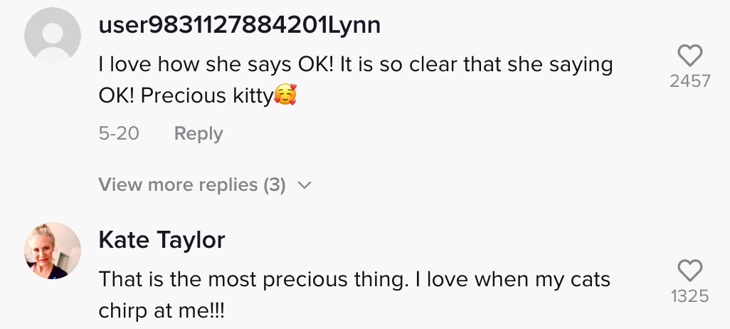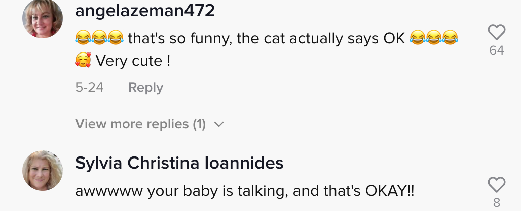 Namun, apa yang lebih menarik perhatian adalah kucing berkenaan turut menyahut tuannya dengan berkata perkataan sama iaitu "ok". Gelagatnya itu membuatkan si tuan tergelak kecil mendengar suara si comel itu.