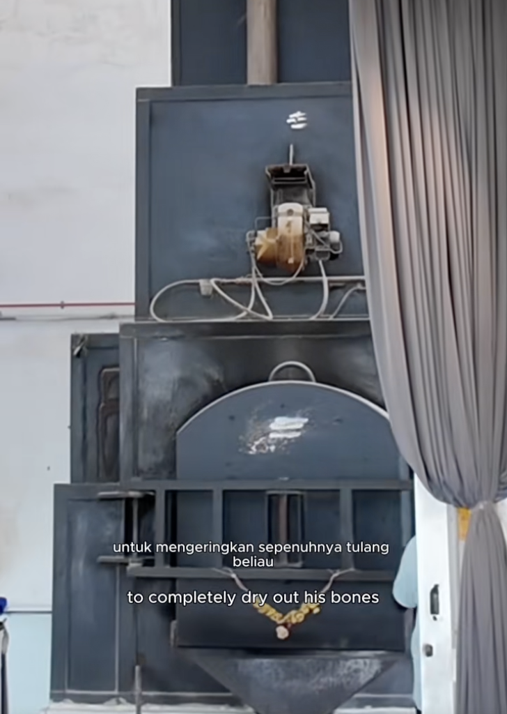 Setelah selesai proses mengutip tulang rangka mendiang ayahnya, ia dimasukkan ke dala kebuk pembakaran yang menggunakan suhu pembakaran yang tinggi untuk keringkan tulang itu sepenuhnya.