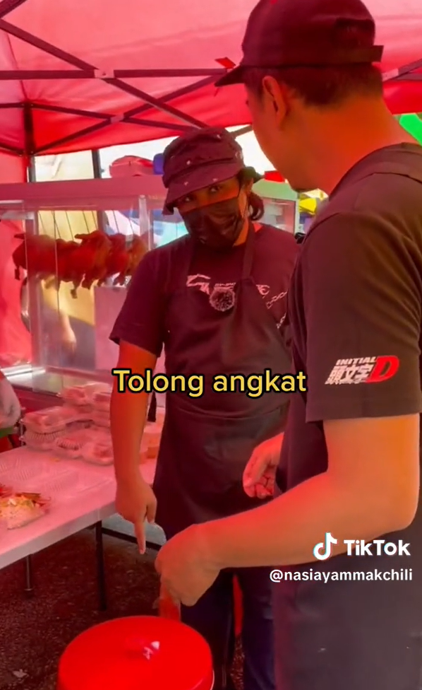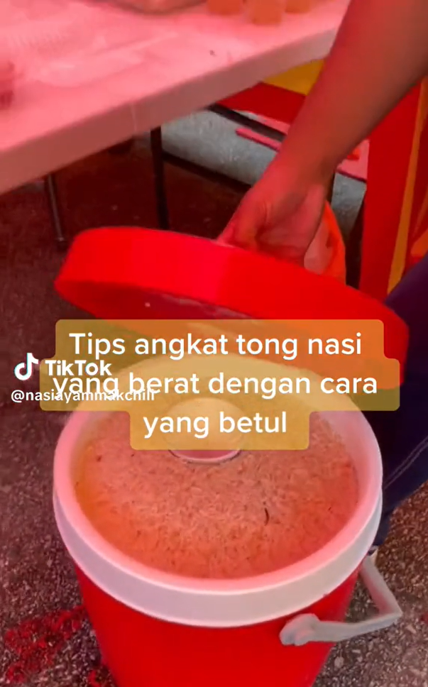 Menerusi video yang dimuat naik oleh @nasiayammakchili di TikTok, kelihatan seorang lelaki sedang menunjukkan teknik yang betul untuk mengangkat tong nasi ayam chili di gerainya di bazar Ramadan Taman Melawati.