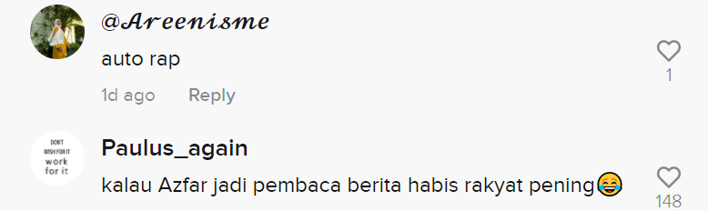 Dalam pada itu, tinjauan di ruangan komen mendapati rata-rata netizen turut merasa terhibur melihat video tersebut. Malah, ada yang menyamakannya seperti penyanyi rapper.