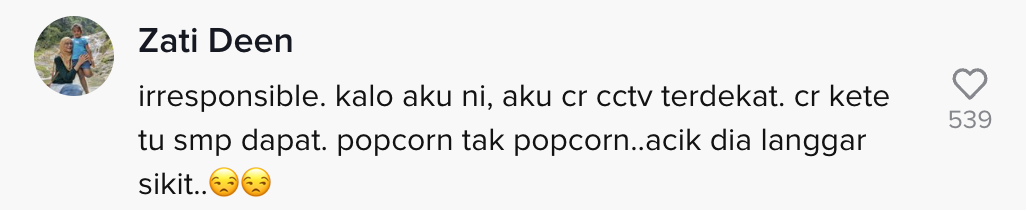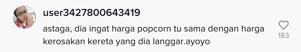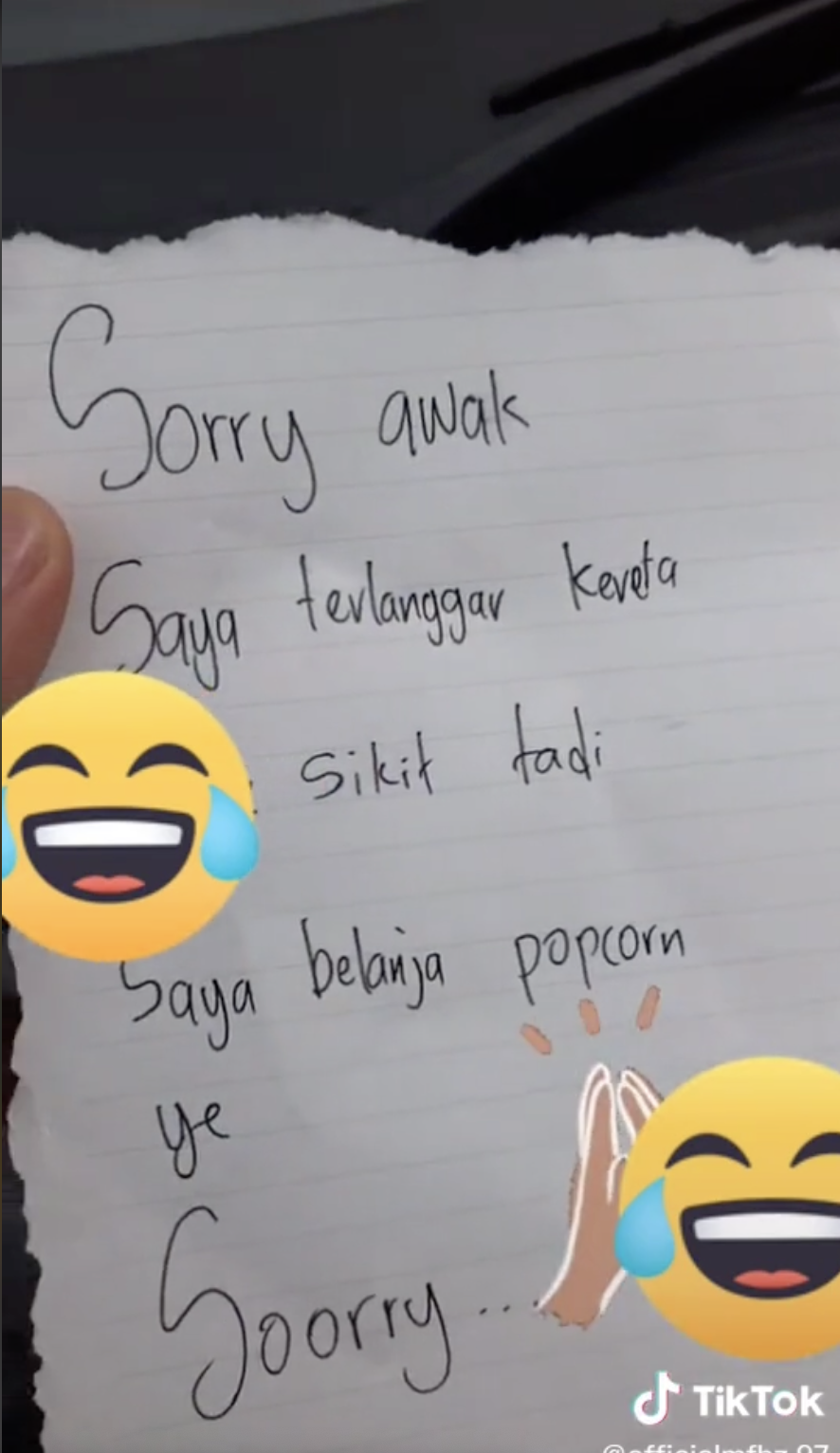 "Sorry awak, saya terlanggar kereta awak sikit tadi. Saya belanja popcorn ye. Sorry," tulisnya.