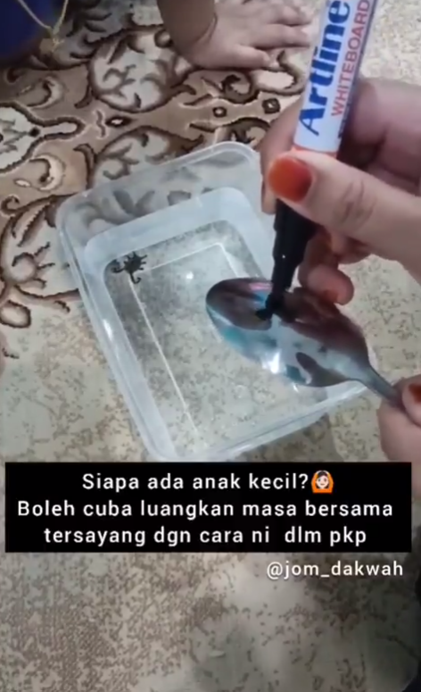 Dia dilihat menunjukkan sebuah bekas berisi air sambil memegang sudu besi dan marker pen. Kemudian dia melukis beberapa haiwan di atas sudu besi tersebut dengan marker pen.
