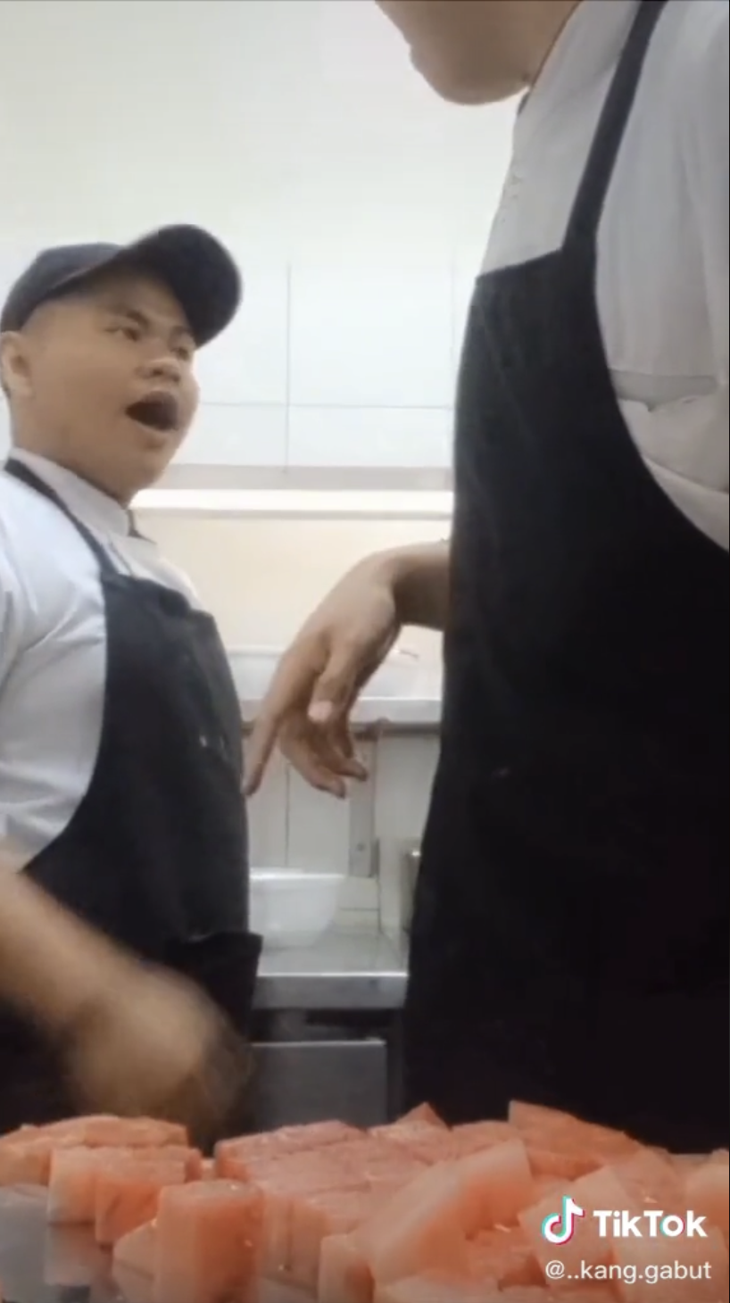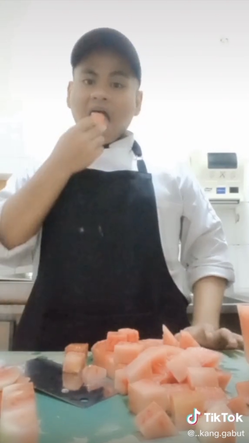 Menerusi video yang dikongsikan oleh @..kang.gabut di TikTok, kelihatan seorang lelaki sedang memotong buah tembikai di dapur. Kemudian, dia memasukkan potongan tembikai itu ke dalam mulut lalu memakannya.