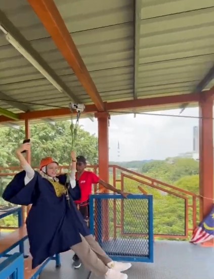 Menerusi sebuah video yang tular di TikTok itu, dapat dilihat sekumpulan gadis memakai jubah konvokesyen sambil melakukan aktiviti flying fox.